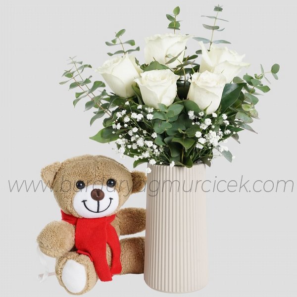vazoda 5 beyaz gül ayıcık ürüne ait açıklama eklenmemiş.